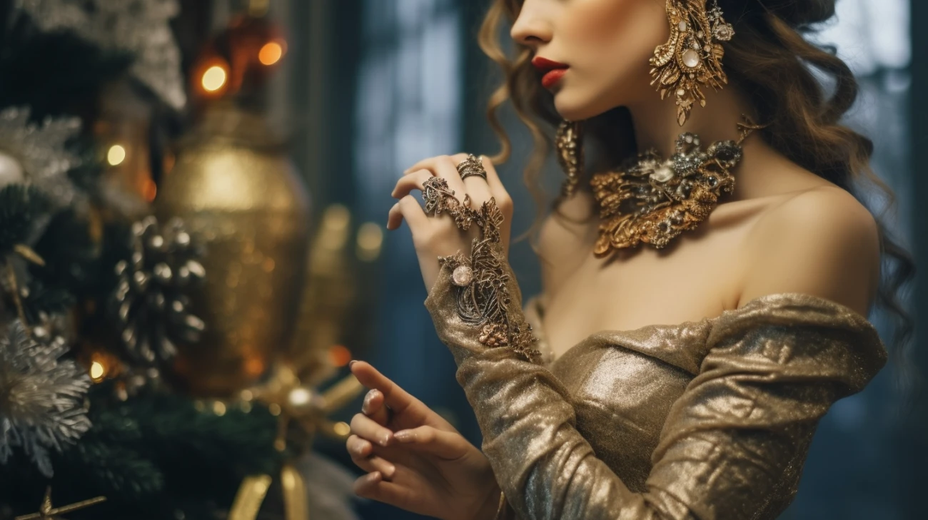 Do złotej sukienki księżna Charlene dobrała wiele okazałej biżuterii ze srebra, która doskonale koresponduje z odcieniami sukni oraz świątecznej scenerii. Na szyi księżnej zawisły długie, stylowe kolczyki z drobnymi kamieniami, a na nadgarstku piękną, szeroką bransoletkę ze srebra z kamieniami i cyrkoniami.